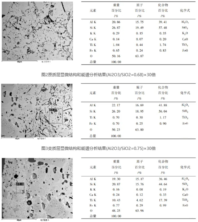 從熱力學(xué)上看,Al?O?-SiO?系材料[4]各物相在氯化反應(yīng)中:莫來(lái)石相(A?S?)非常不穩(wěn)定,其成份見(jiàn)表2,石英相(SiO?)非常穩(wěn)定,剛玉相(Al?O?)居中;在碳熱還原中:石英相非常不穩(wěn)定,剛玉相非常穩(wěn)定,莫來(lái)石相居中。在實(shí)際中,爐襯材料是如何損壞的,其過(guò)程是怎樣發(fā)生的,這要從殘磚顯微結(jié)構(gòu)分析入手。
