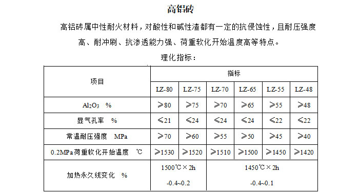 高鋁磚按含鋁量分為四個等級,三級含鋁量不低于百分之55,二級含鋁量不低于65,一級含量不低于75,特種高鋁耐火磚含鋁量在85以上。至于高鋁磚的形狀,除了標準磚,還有通用型,也叫異型磚,如果形狀非常不規則的話通常叫做特異型高鋁磚。高鋁磚相關理化指標: